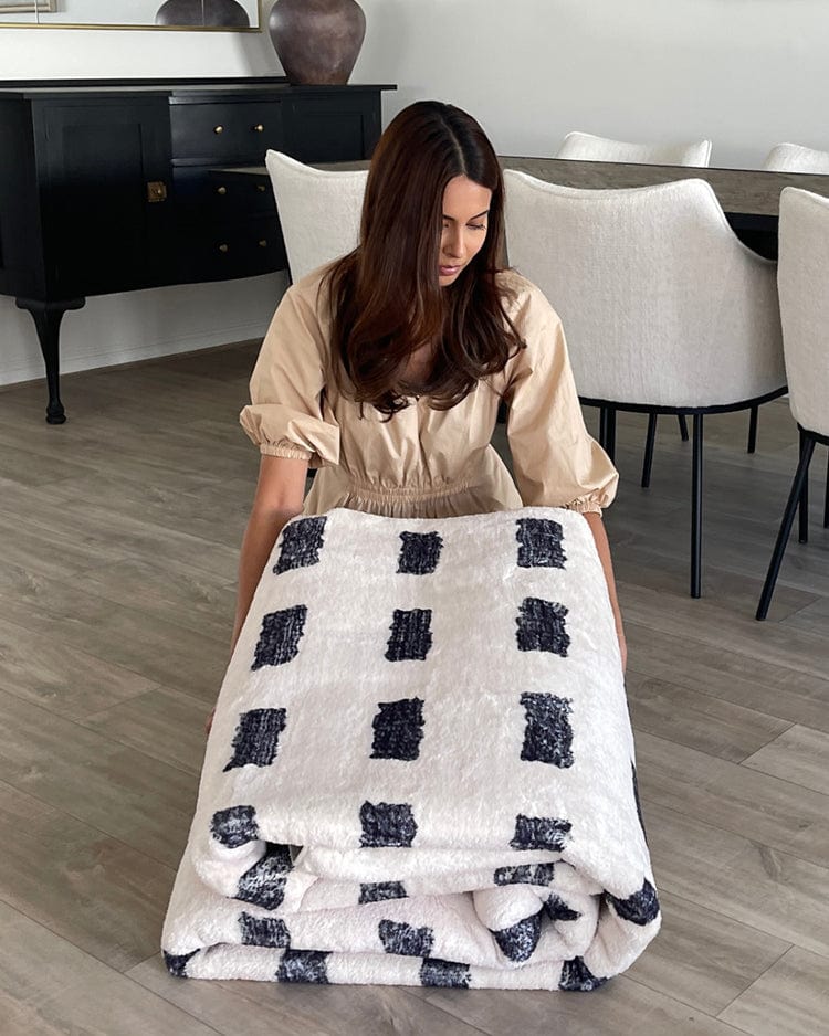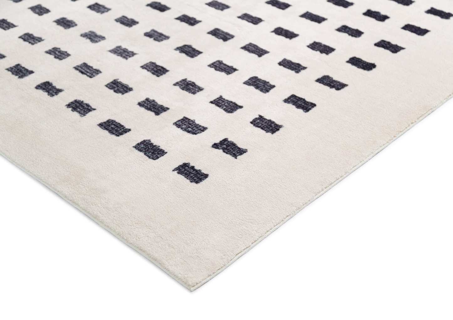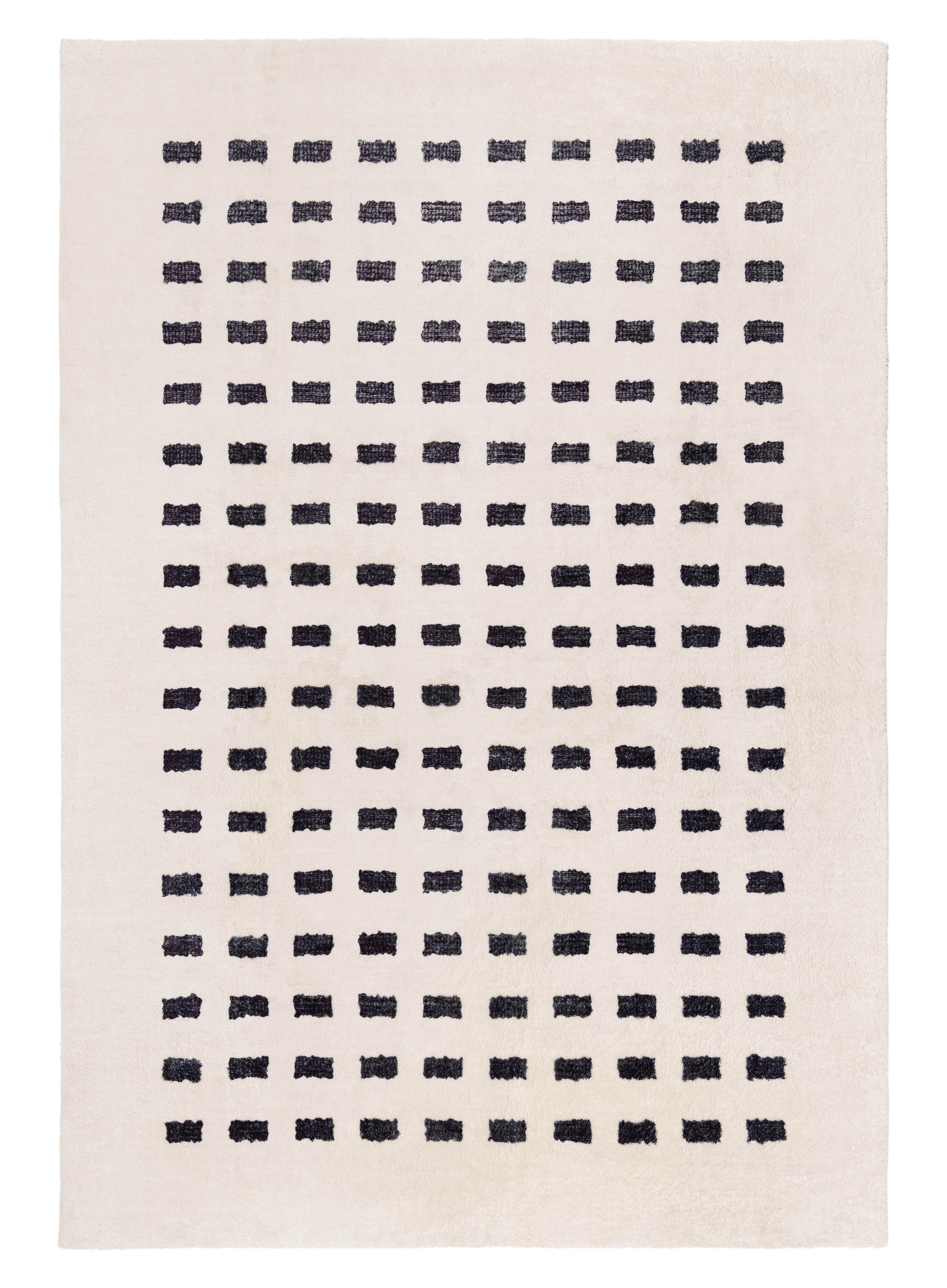 Minimal rectangle pattern in charcoal black tones on an ivory-based background. A uniquely modern and contemporary rug design to accent any space and decor.